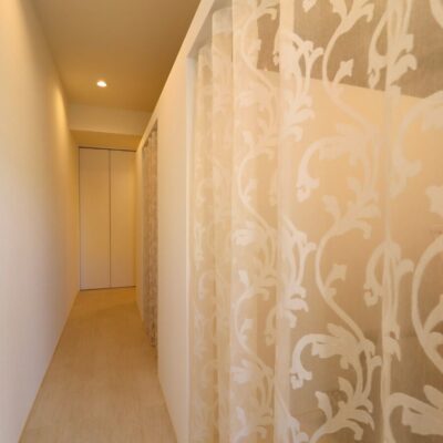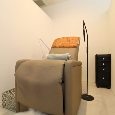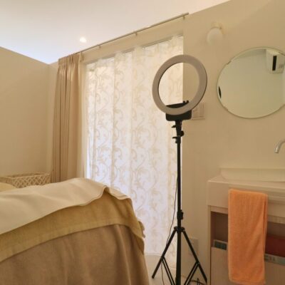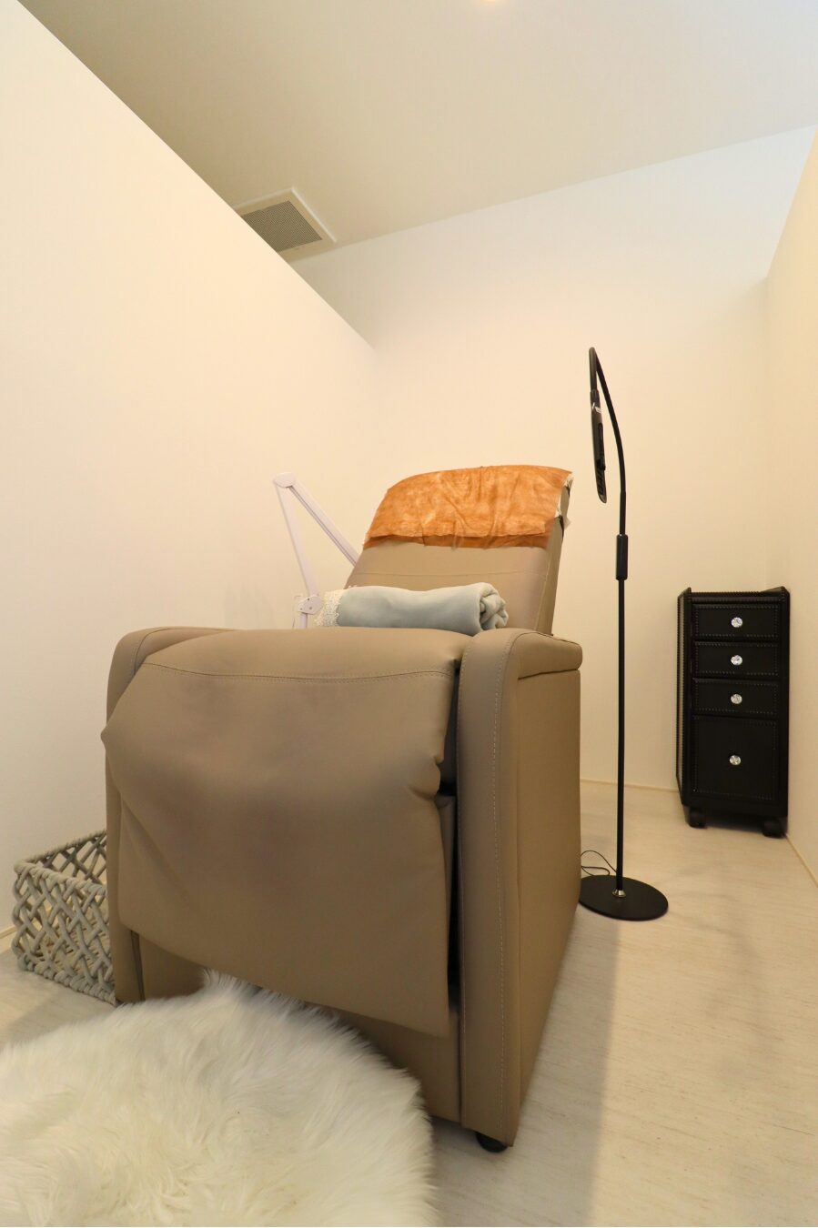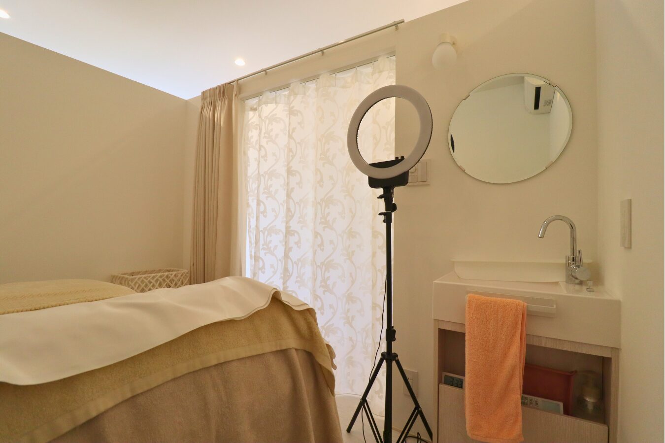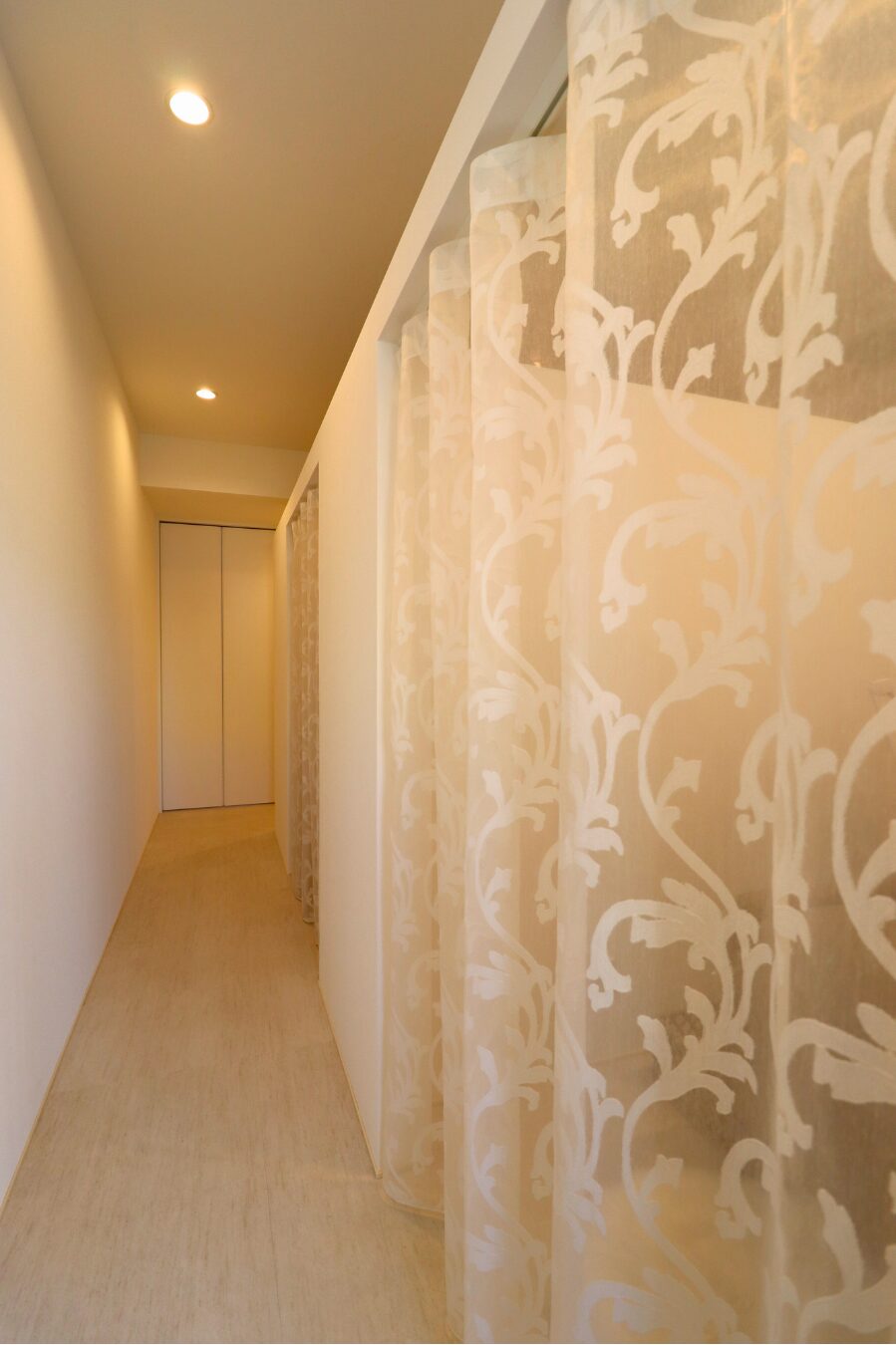 施術スペースは柔らかな照明と透け感のある柄入りカーテンが、エステサロンらしい上品さをプラス。